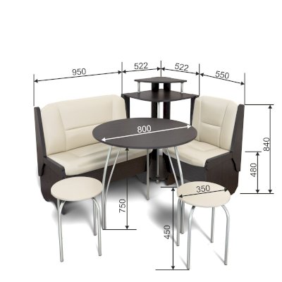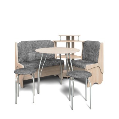 Оригинальный кухонный уголок Лотос отличается от других похожих кухонных гарнитуров. Он состоит из двух отдельных диванчиков и этажерки, заменяющей угловую мягкую часть. Круглый кухонный стол в отличие от других наборов мебели на металлическом основании как и два круглых табурета. Набор мебели для кухни включающий в себя большую прямую скамью,малую прямую скамью,угловую этажерку, стол на металлических ногах и два табурета на металлокаркасе. В прямых скамьях под сиденьями расположены ящики.